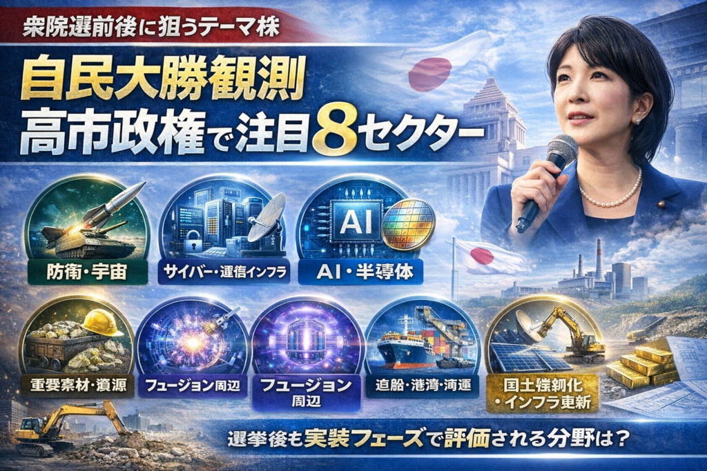 2月8日投開票の衆院選を前に、「自民が単独過半数も視野」という情勢が伝わっています。選挙前後は、政策期待で“テーマ株”が動きやすい一方、短期の思惑買いは反動も起きやすい局面です。そこで本稿では、高市早苗政権が掲げる「17の戦略分野」をベースに... -
