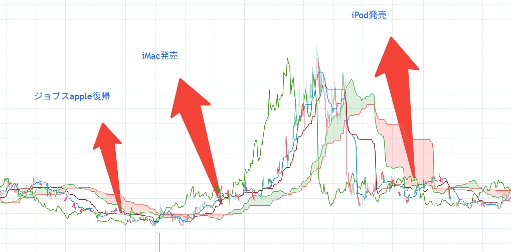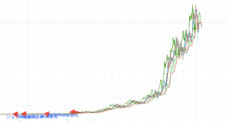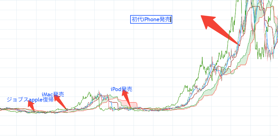 黎明期の評価・話題性: しかし、Appleの道のりも順風満帆ではありませんでした。1980年代にApple IIの成功で華々しく上場した同社も、その後は競争激化でシェアを失い1990年代半ばには経営が行き詰まります。当時のAppleは**「かつてのスター企業から斜陽へ」という見方が大勢で、実際1997年には債務超過寸前に陥りました。ジョブズ氏が復帰した直後、競合するDell社のCEOマイケル・デル氏は「もし自分がジョブズなら、Appleを畳んで株主に金を返す**だろう」と公言しています。それほどまでにAppleの将来は悲観視されていたのです。ジョブズ氏はこの発言に反発し、大胆な改革と製品イノベーションを断行しました。その結果、1998年の初代iMac、2001年のiPod、2007年のiPhoneと立て続けにヒットを飛ばし、Appleは見事復活を遂げます。黎明期の株価は長く低迷し、市場の認知度も低い状態でしたが、経営者のビジョンと卓越した製品戦略を信じた投資家は巨額のリターンを得ることになりました。ジョブズ復帰当時にApple株を見限らなかった少数の株主にとって、同社の復活と空前の株価上昇は大きな恩恵となったのです。